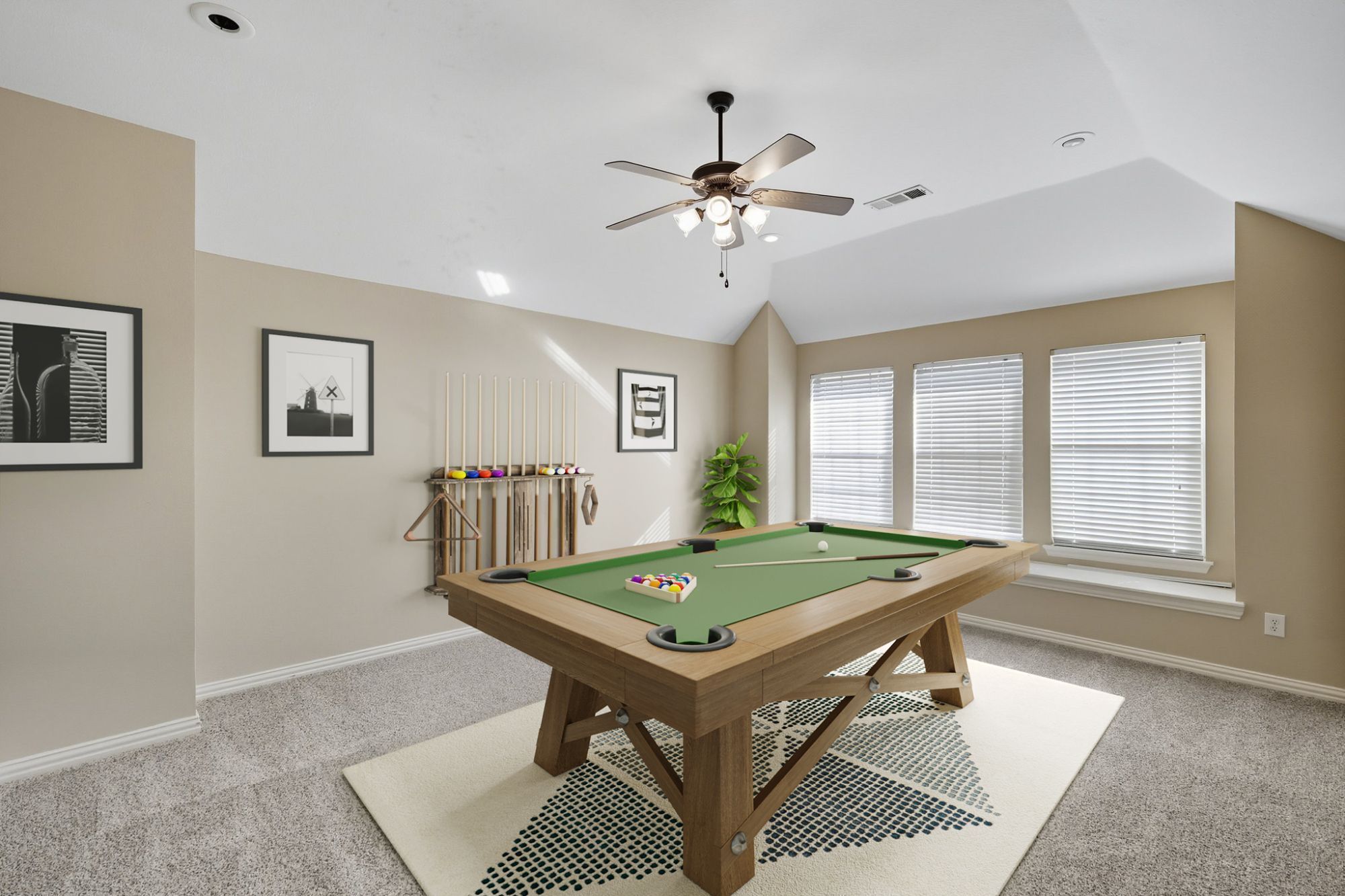 The family room is warm and inviting with a cozy fireplace, wood-look flooring, and an open design that connects effortlessly to the kitchen and dining area. Upstairs, you’ll find a large game room and media room, offering plenty of space for movie nights, playtime, or a home gym setup.