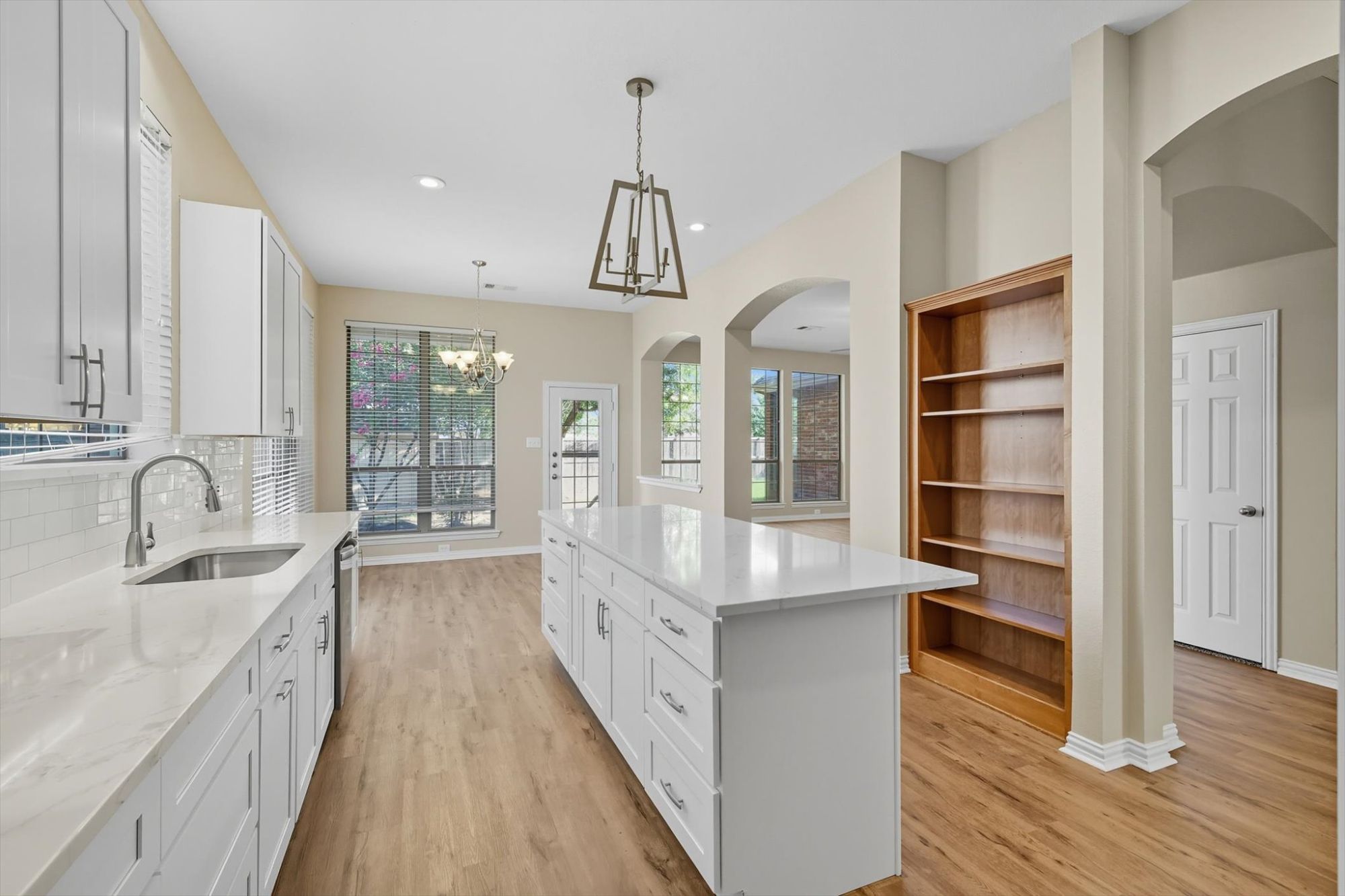 The spacious kitchen is a chef’s dream, featuring a large center island, gas cooktop, new cabinetry, and ample counter space for prep and storage. The kitchen flows seamlessly into the dining and living areas, making it the heart of the home — ideal for entertaining or everyday family life.