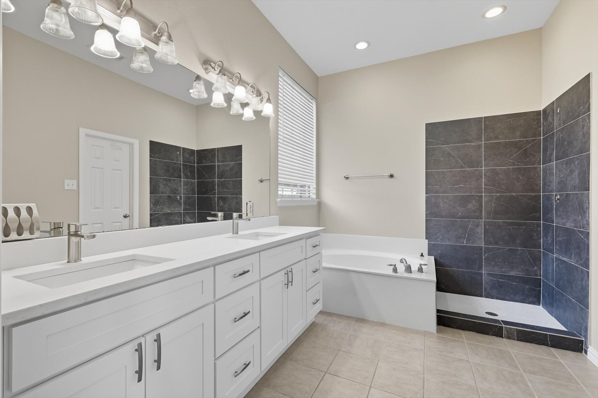 The first-floor primary suite is a true retreat, featuring a double vanity, retiled walk-in shower, separate soaking tub, and a large walk-in closet. Upstairs, three spacious secondary bedrooms and two full bathrooms provide flexibility for guests, family, or home office needs.